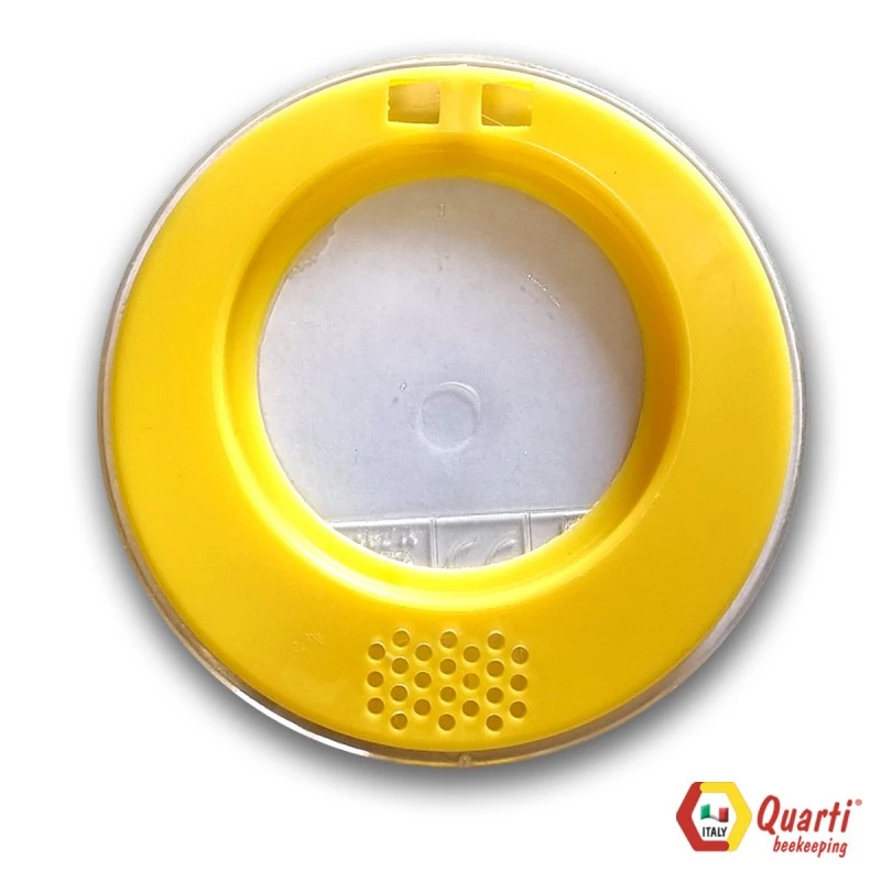 L'apiscampo rotondo di Quarti per rimuovere le alzate di miele è uno strumento altamente efficace per rimuovere le api dal nido prima della raccolta del miele. Questo chasse-abeilles viene posizionato tra il corpo del nido e l'alzata di miele, consentendo alle api di lasciare l'alzata e scendere verso il corpo del nido senza poter tornare indietro.