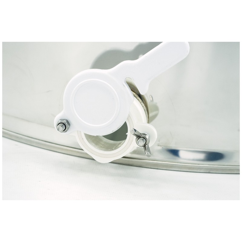Depois da decantação, o depósito vem equipado com uma torneira plástica alimentar tipo guilhotina de 1,5”, útil para envasar o mel em frascos ou baldes. Trata-se de uma torneira básica, adequada para uso standard, mas que pode ser facilmente substituída graças à rosca metálica interior.